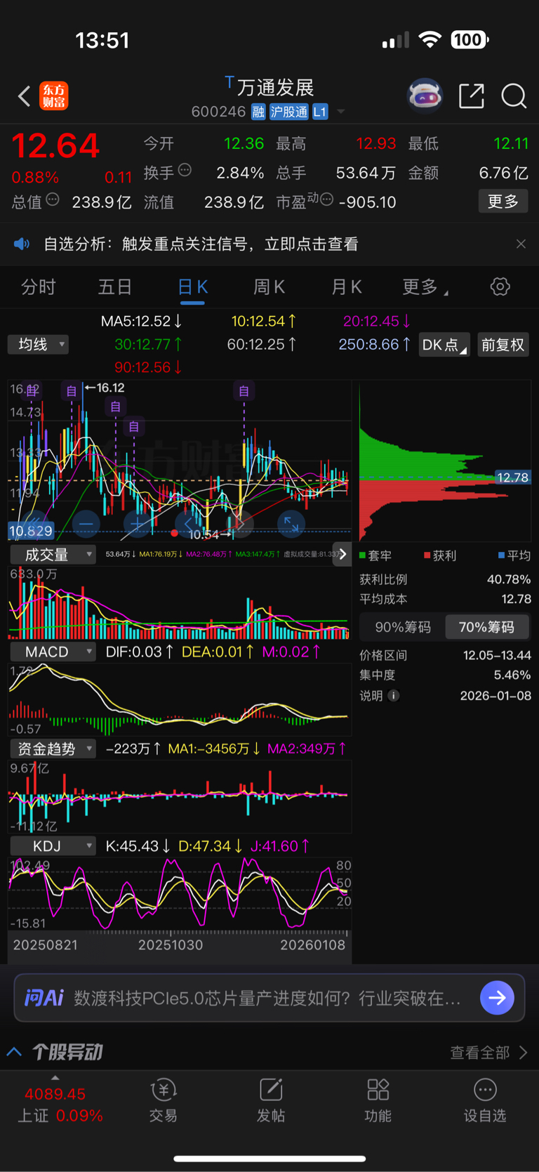 1. 反弹的前提是量能与筹码配合:2025年11月人气触底后股价拉升,伴随成交量温和放大(第二张图日K成交量柱体回升)、MACD形成金叉(DIF上穿DEA),筹码集中度达5.46%(90%筹码集中在12.05-13.44元),下方有支撑;若仅人气触底但量能萎缩、筹码分散,股价难以拉升。