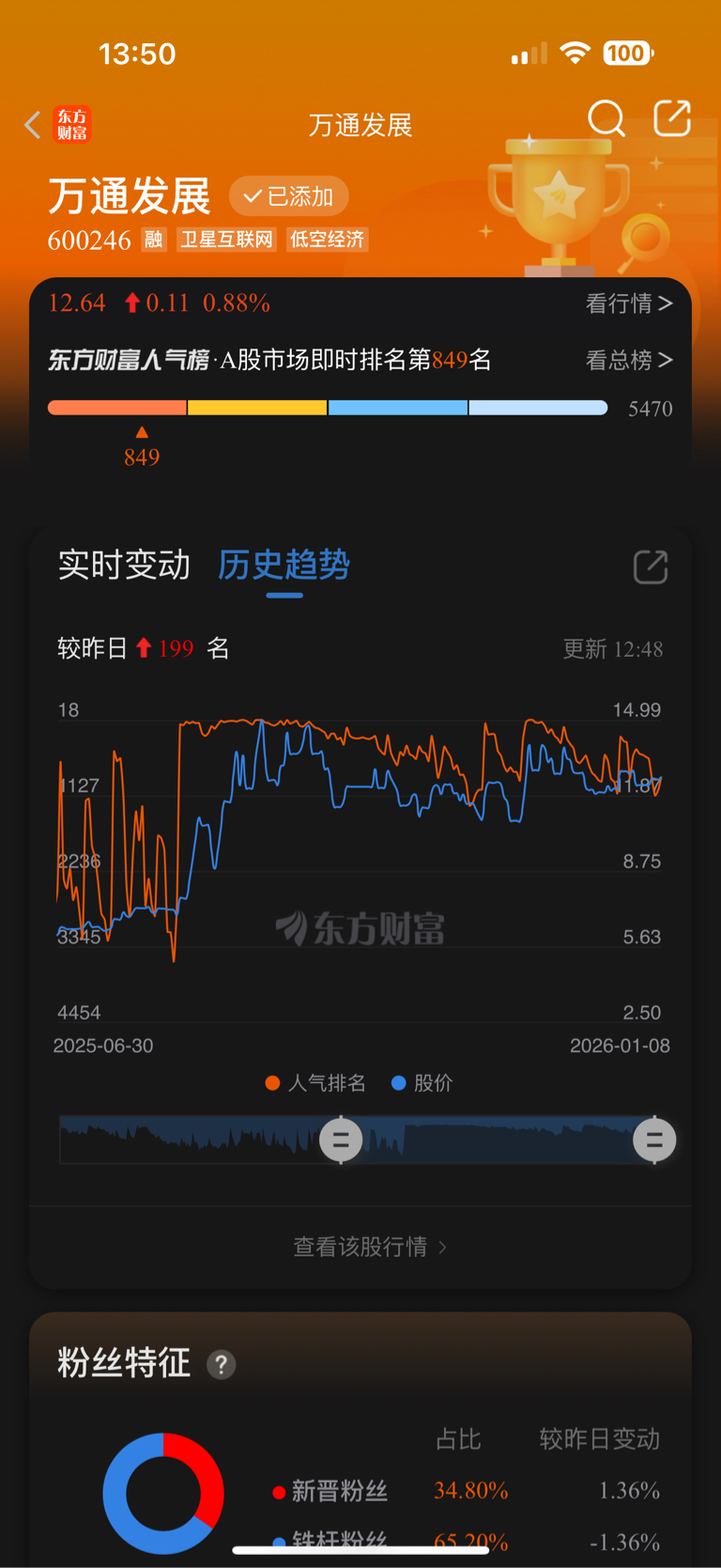 2025年9月至今,万通发展的人气排名(橙色线)与股价(蓝色线)呈现显著的「反向联动+触底共振」特征,具体关联表现为: