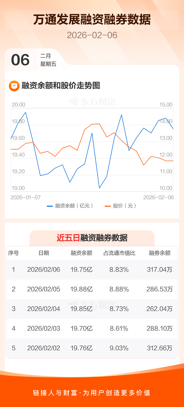 交易所最新数据显示,万通发展于2026年2月6日获融资买入3639.81万元,融资偿还4936.73万元,当日融资净偿还1296.92万元。目前,该股融资余额19.75亿,占流通市值比例为8.83%。