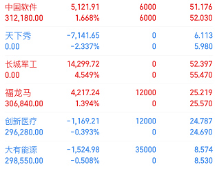 中国软件:今天表现比较弱,格尔去冲板它都没什么表现,唯一还能值得称道的是今天是跳上了小平台,反弹势头看起来还是有的,其实尾盘卖天下秀的时候想一起卖了它,懒得耗时间,但是看见好像今晚出三季报,再等一晚,明天卖,没多大预期,至少这业绩不会比去年差。