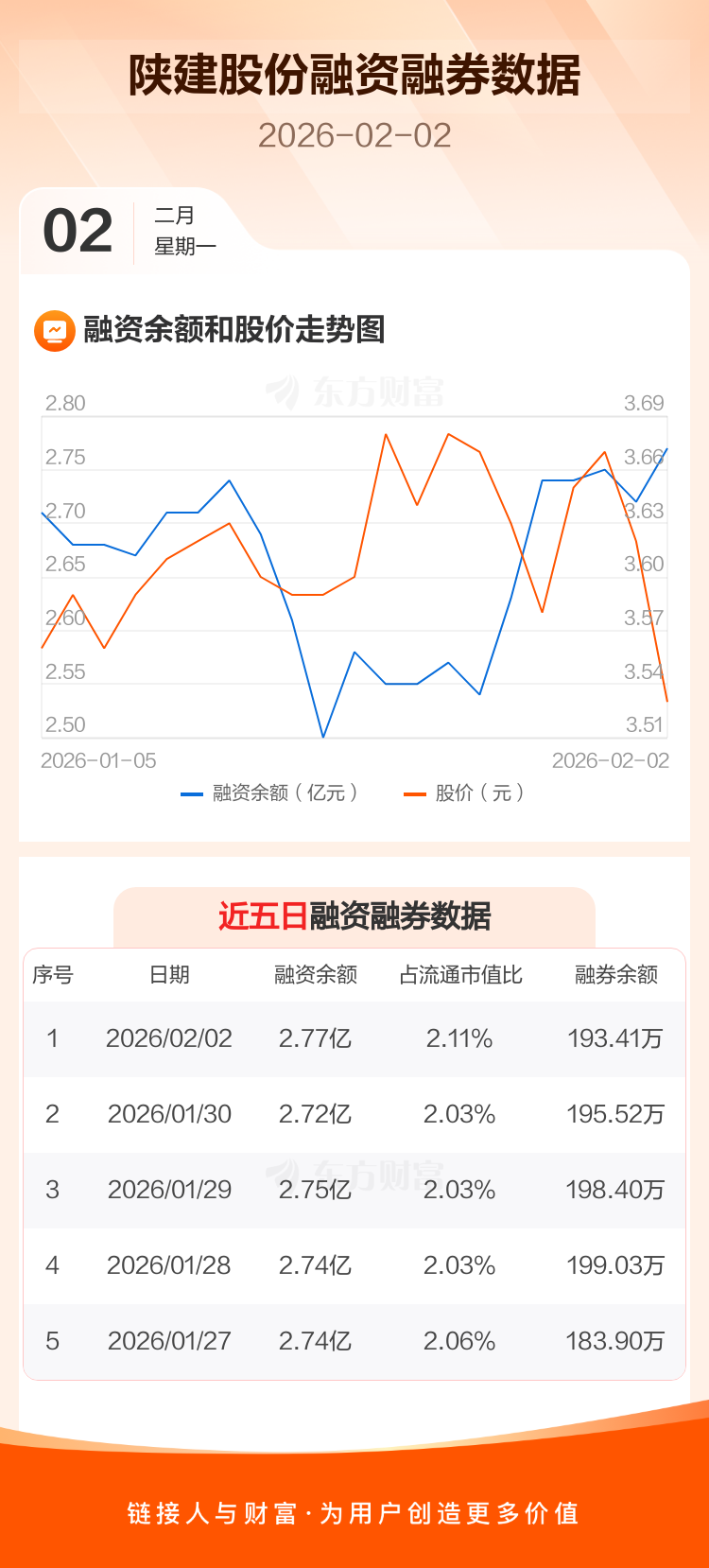 交易所最新数据显示,陕建股份于2026年2月2日获融资买入1549.38万元,融资偿还1132.88万元,当日融资净买入416.5万元。目前,该股融资余额2.77亿,占流通市值比例为2.11%。