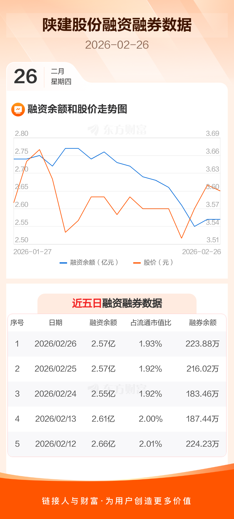 交易所最新数据显示,陕建股份于2026年2月26日获融资买入740.08万元,融资偿还770.03万元,当日融资净偿还29.95万元。目前,该股融资余额2.57亿,占流通市值比例为1.93%。