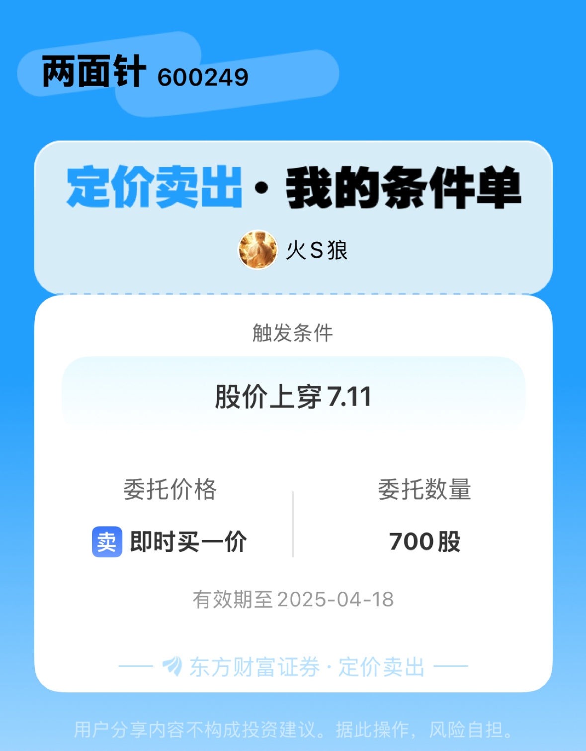 #条件单交流# #定价卖出晒单# 一位股神设置了一个定价卖出条件单,接下来就是见证奇迹的时刻~$两面针(SH600249)$