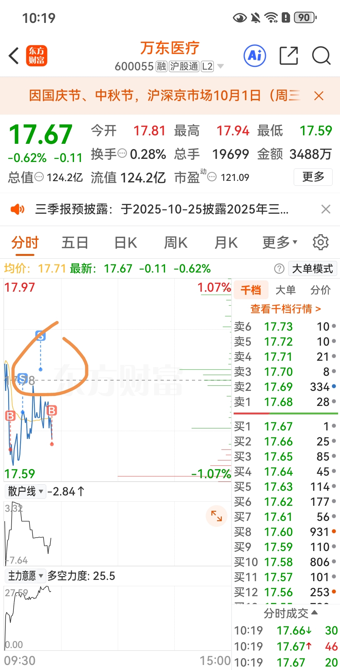 $两面针(SH600249)$ $广济药业(SZ000952)$ $*ST沐邦(SH603398)$ 介绍一种隔空做t法,有的股喜欢上蹿下跳,突然出买单砸单,可以高挂一毛钱,都能成交。比如万东,我是底仓,成本很低,这个股有潜力,可能几倍。