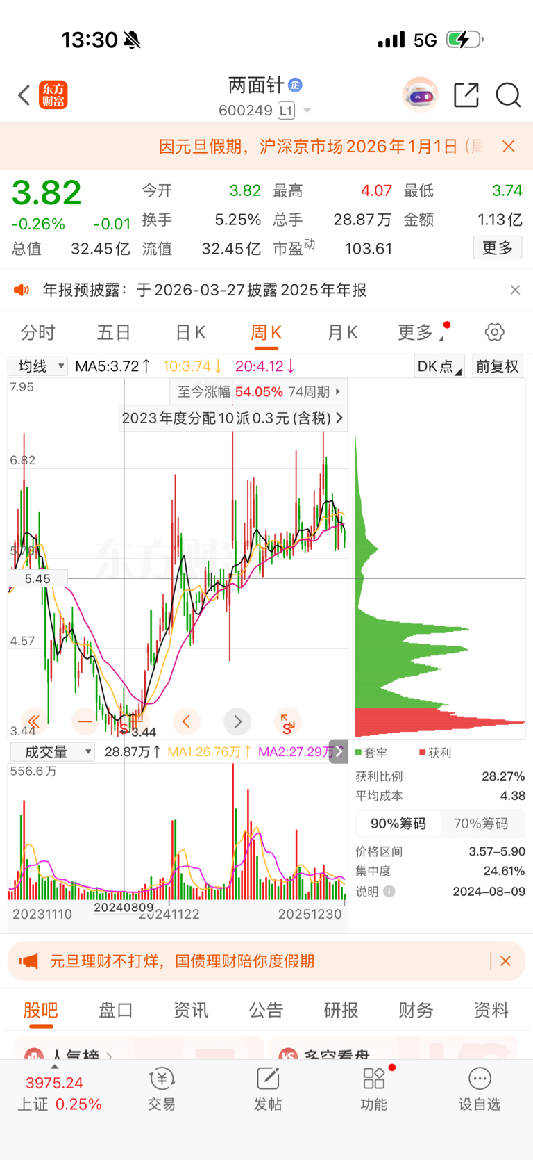 $两面针(SH600249)$ 4块再买,3块多涨上来的