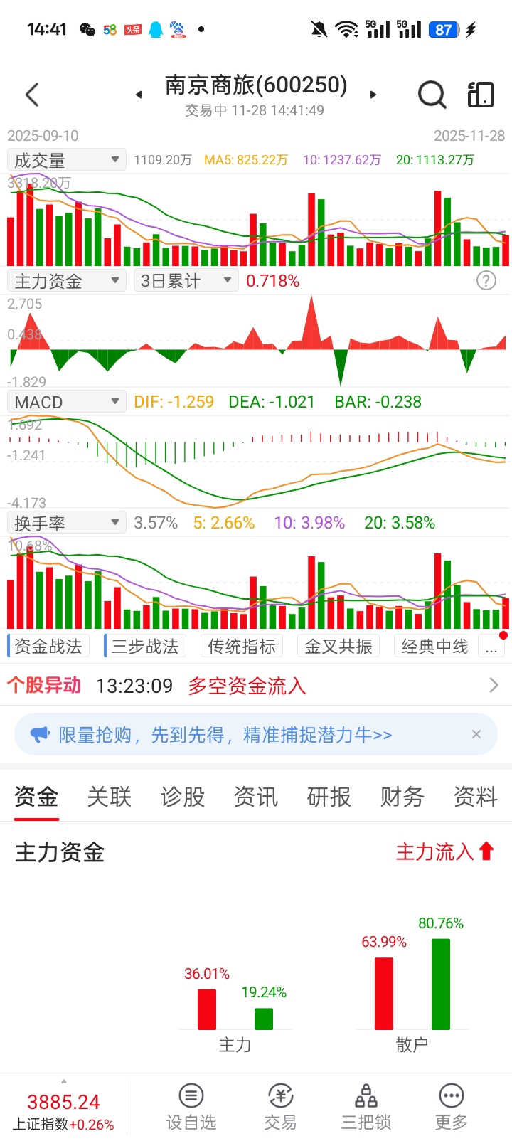 $南京商旅(SH600250)$ 主力进入了下个星期涨停板