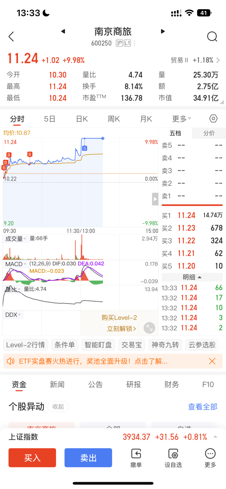 $南京商旅(SH600250)$ 有异动,那还犹豫啥,直接打满。但是这个涨停来的比我预期中的快太多,而且个人感觉先把成本降到安全的位置更重要,所以再做个T。明天直接来个一字好好打我脸让兄弟们爽一爽