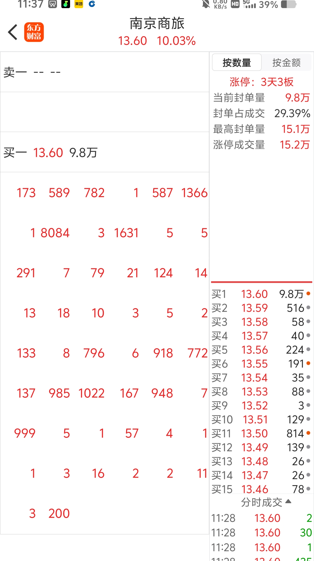 $南京商旅(SH600250)$ 我有个疑问,买一显示9.8万手,而我把level2里的单子加起来,总共才3万多手,为什么