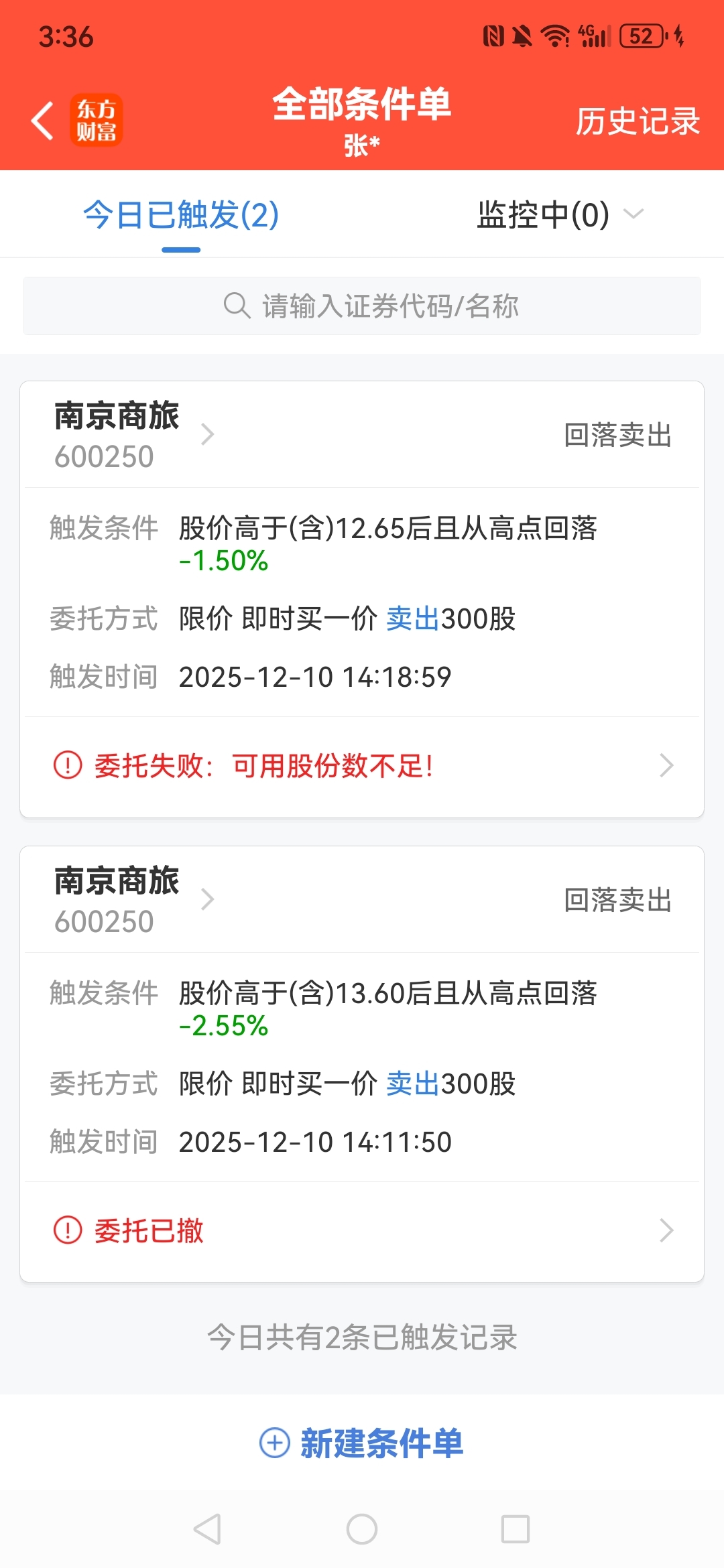 请问大师们,我这个南京商旅13.6涨停后委托回落2.55%时自动卖出,为什么回落