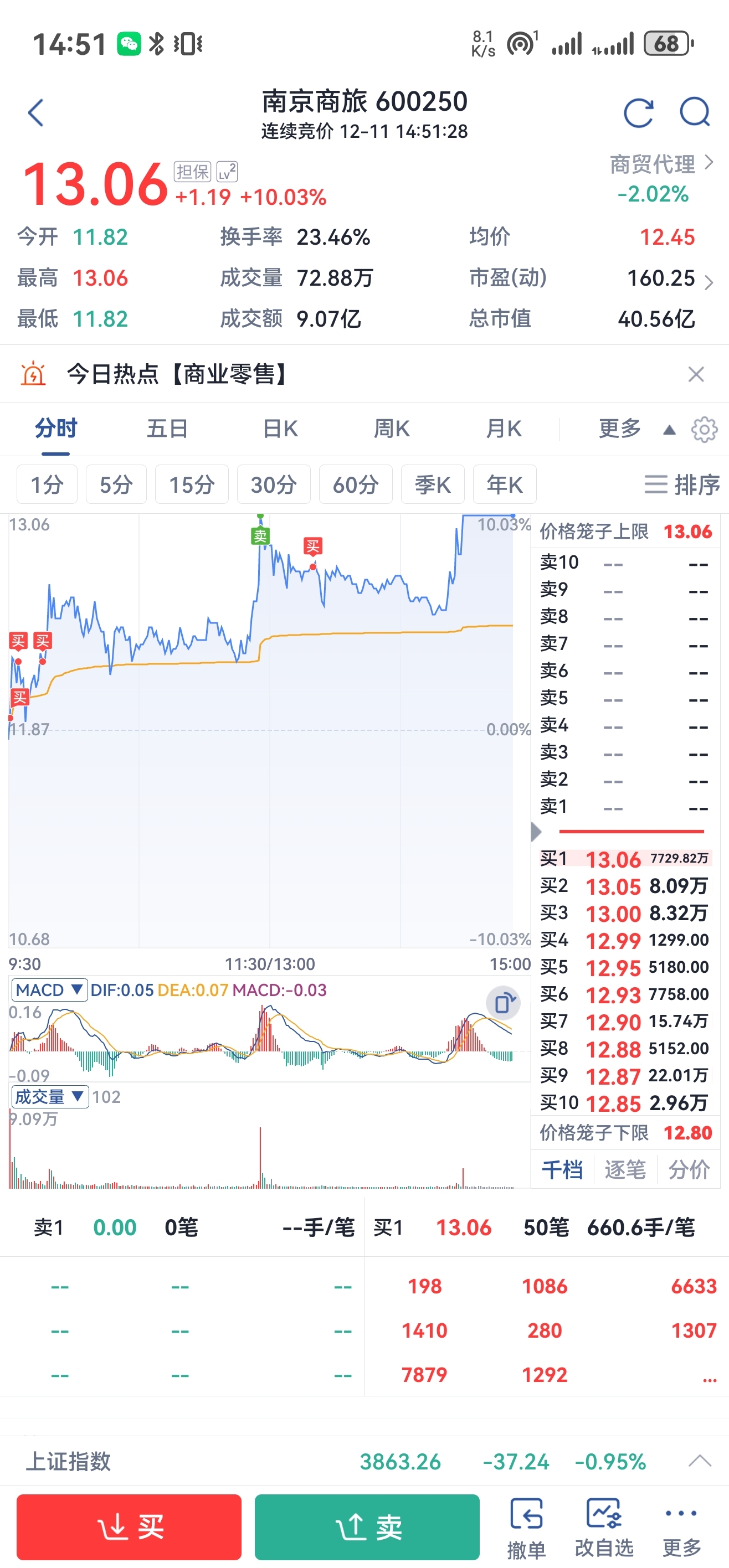 $南京商旅(SH600250)$ 昨天打板进,尾盘下杀浮亏十二个点,早盘继续加仓,午盘涨停卖出做t,下午再入两手