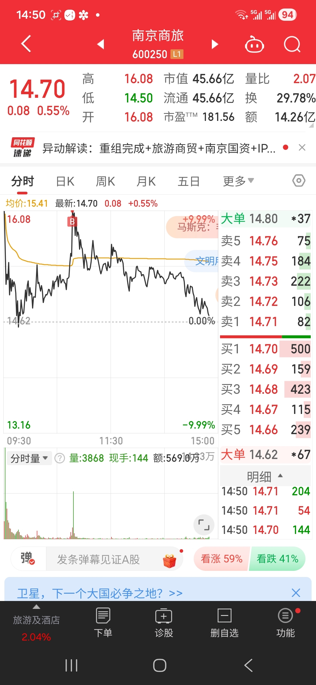 $南京商旅(SH600250)$ 正好在电梯里,撤单时卡了0.5秒钟,就成交了。这就是缘分到了