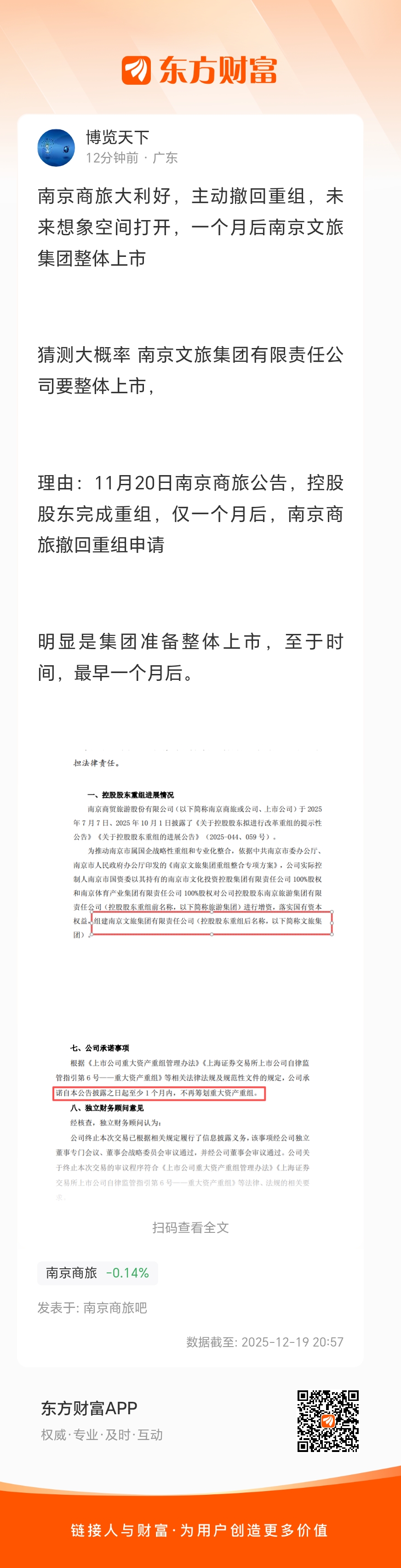 南京商旅大利好,主动撤回重组,未来想象空间打开,一个月后南京文旅集团整体上市