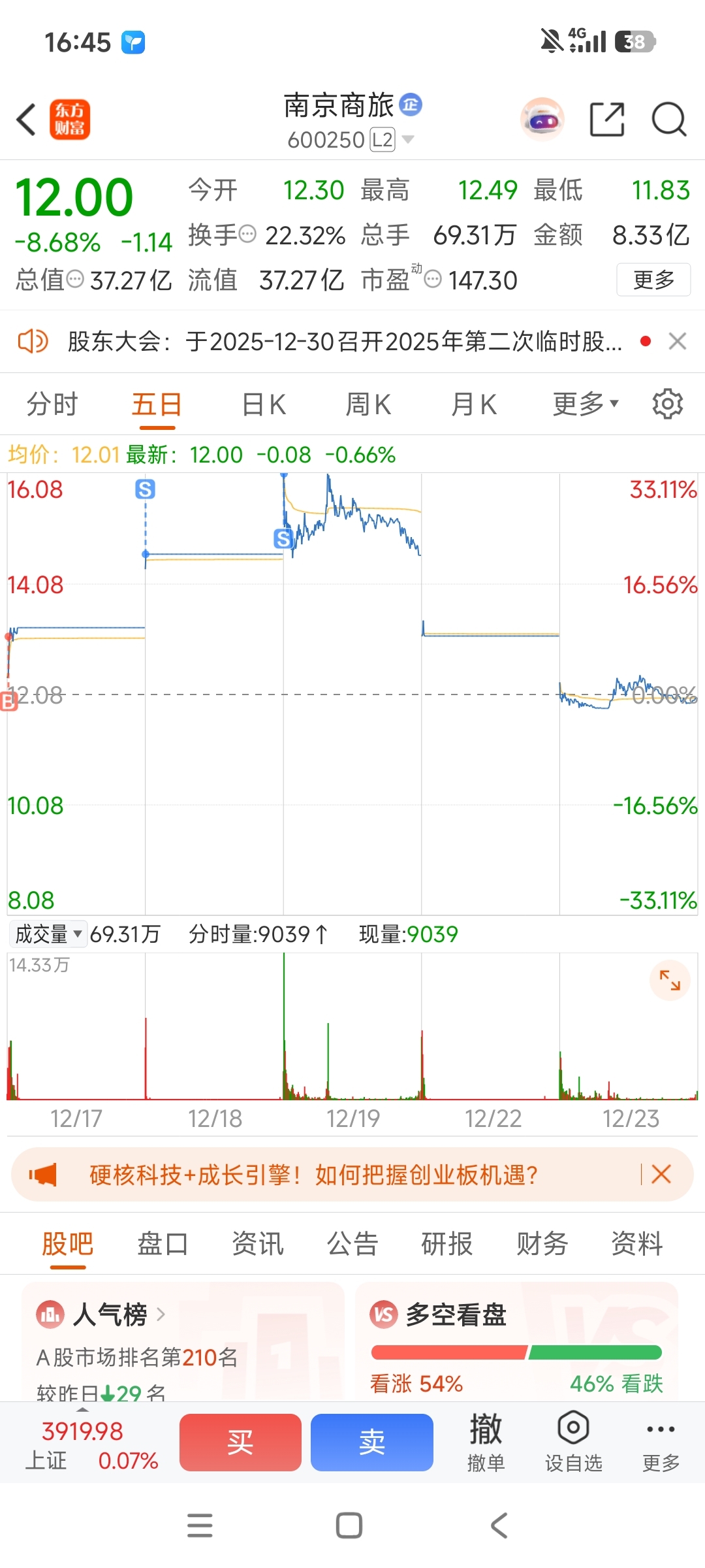 $南京商旅(SH600250)$ 韭菜们亏麻了