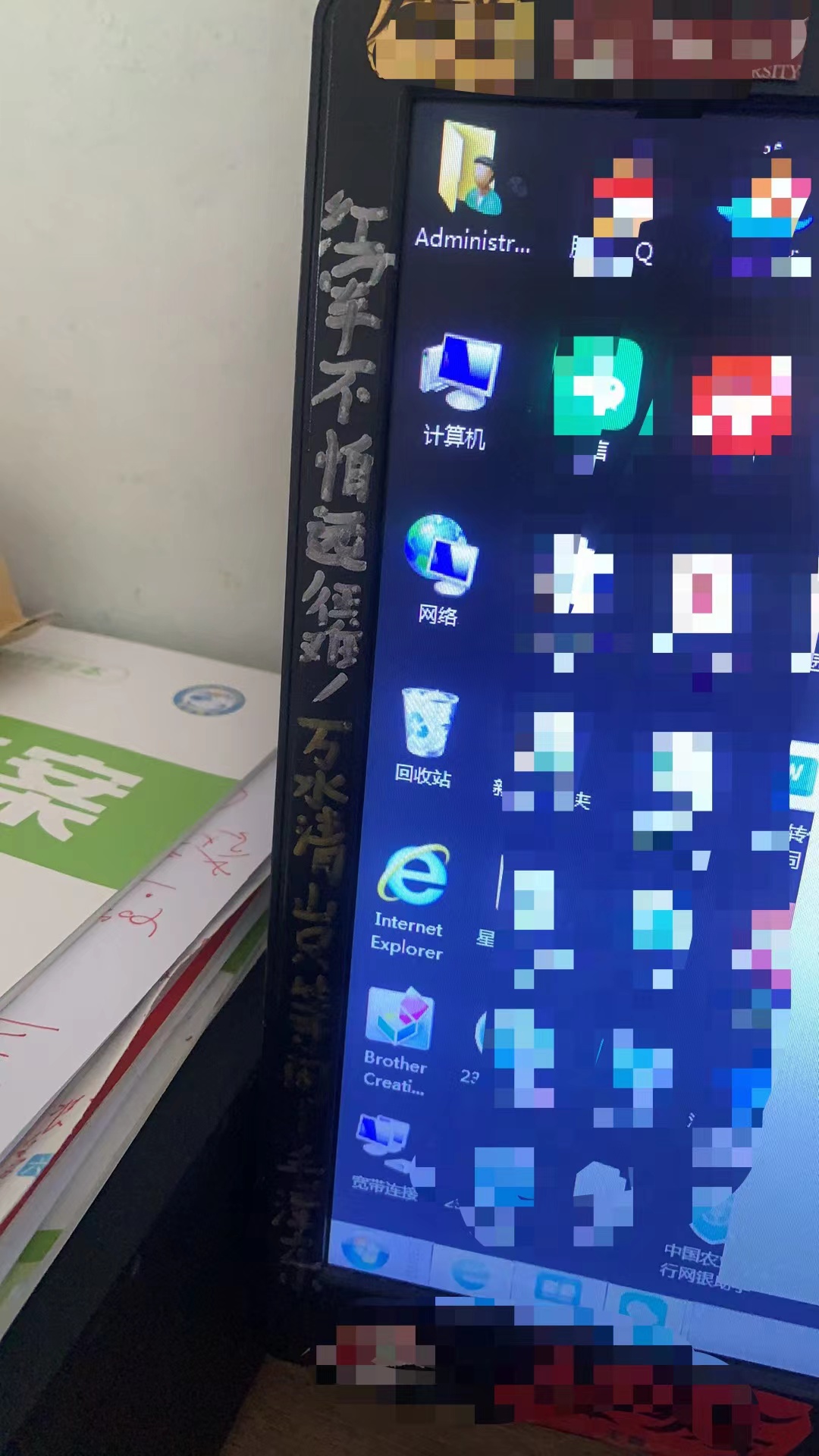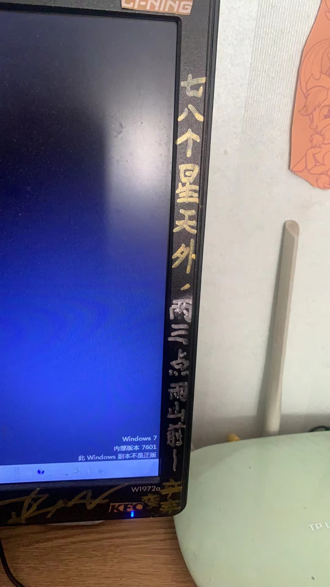 这是我电脑屏左右边框的两句诗句大约是9月的时候儿子在这边涂鸦的。
