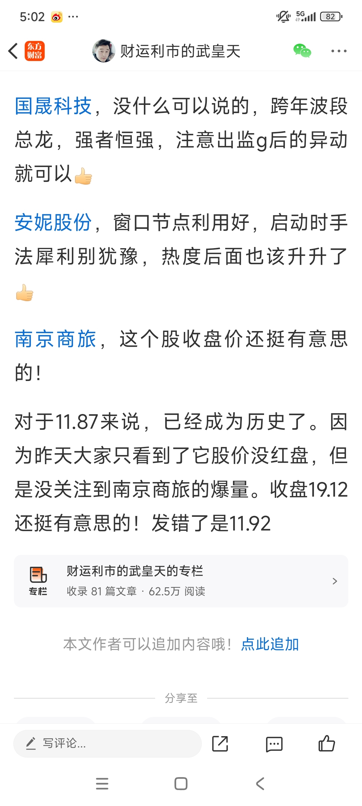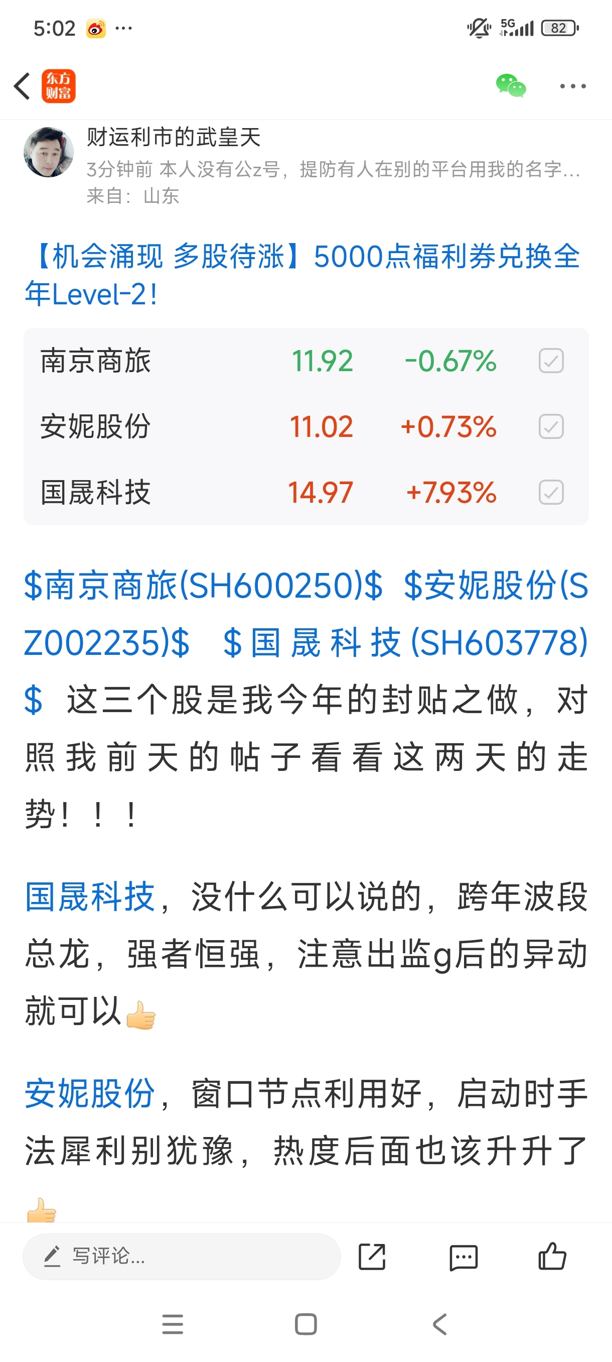 $南京商旅(SH600250)$ $国晟科技(SH603778)$ $安妮股份(SZ002235)$ 首先恭喜安妮股份在周四的窗口节点前买入的股友,等来了公告。明天可以高枕无忧了,毕竟有先手怎么都是肉