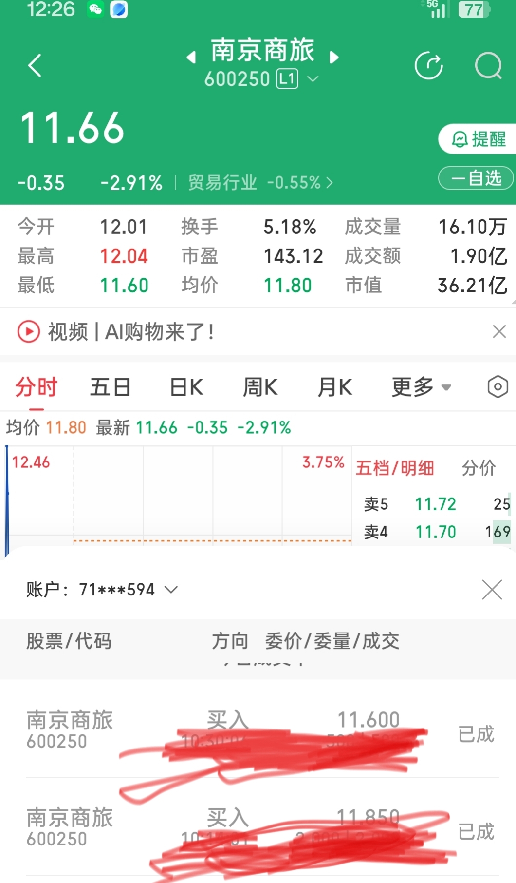 $南京商旅(SH600250)$ 好像买到了,11.60,明天继续