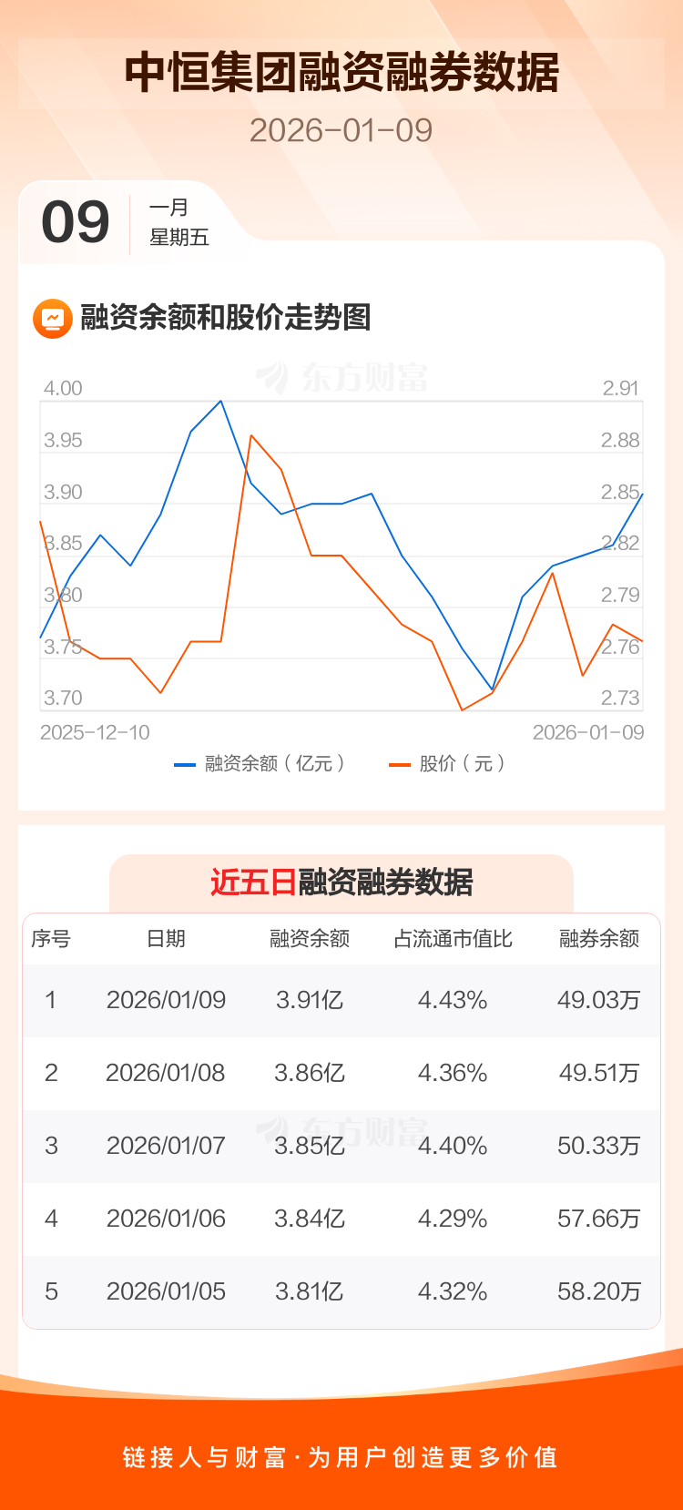 交易所最新数据显示,中恒集团于2026年1月9日获融资买入1871.74万元,融资偿还1327.73万元,当日融资净买入544.01万元。目前,该股融资余额3.91亿,占流通市值比例为4.43%。