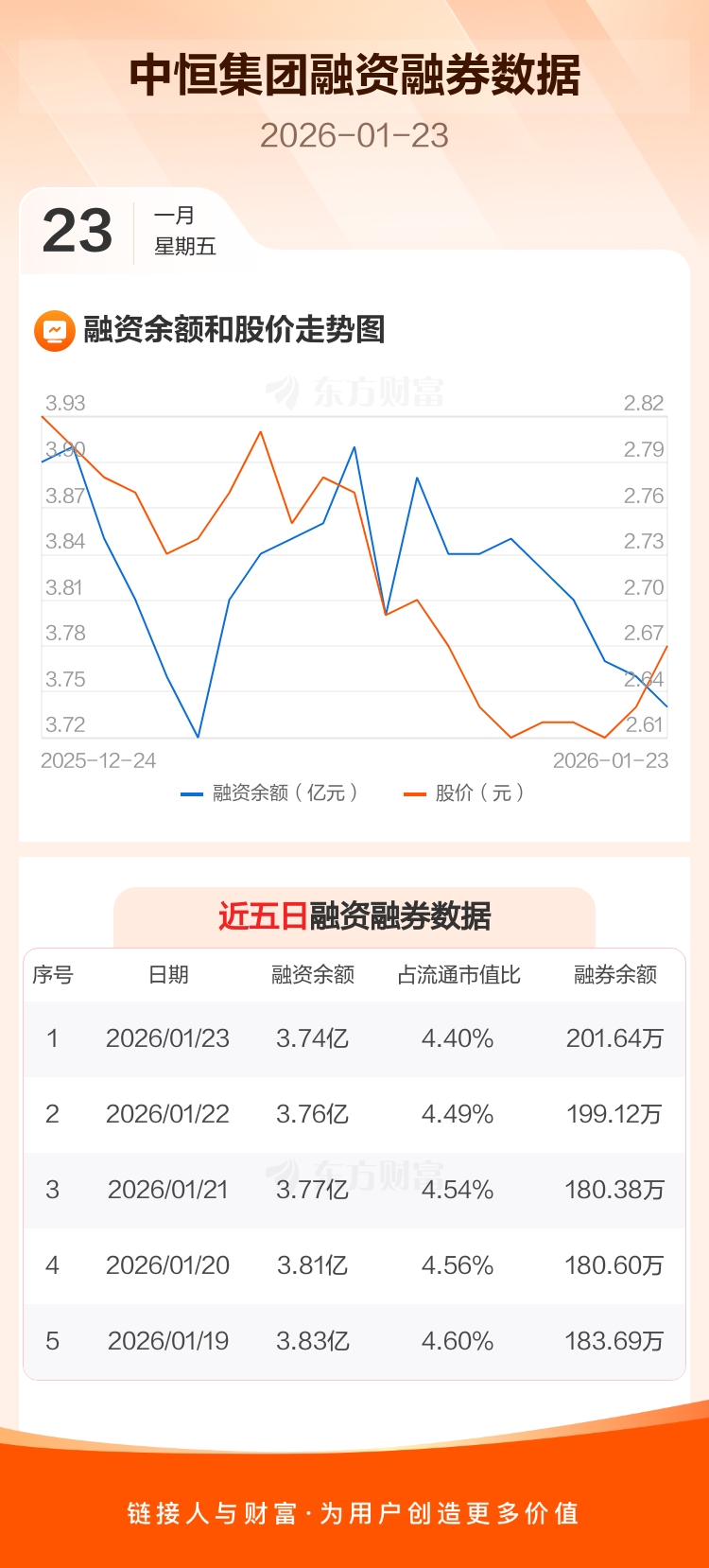 交易所最新数据显示,中恒集团于2026年1月23日获融资买入1117.02万元,融资偿还1368.14万元,当日融资净偿还251.11万元。目前,该股融资余额3.74亿,占流通市值比例为4.40%。