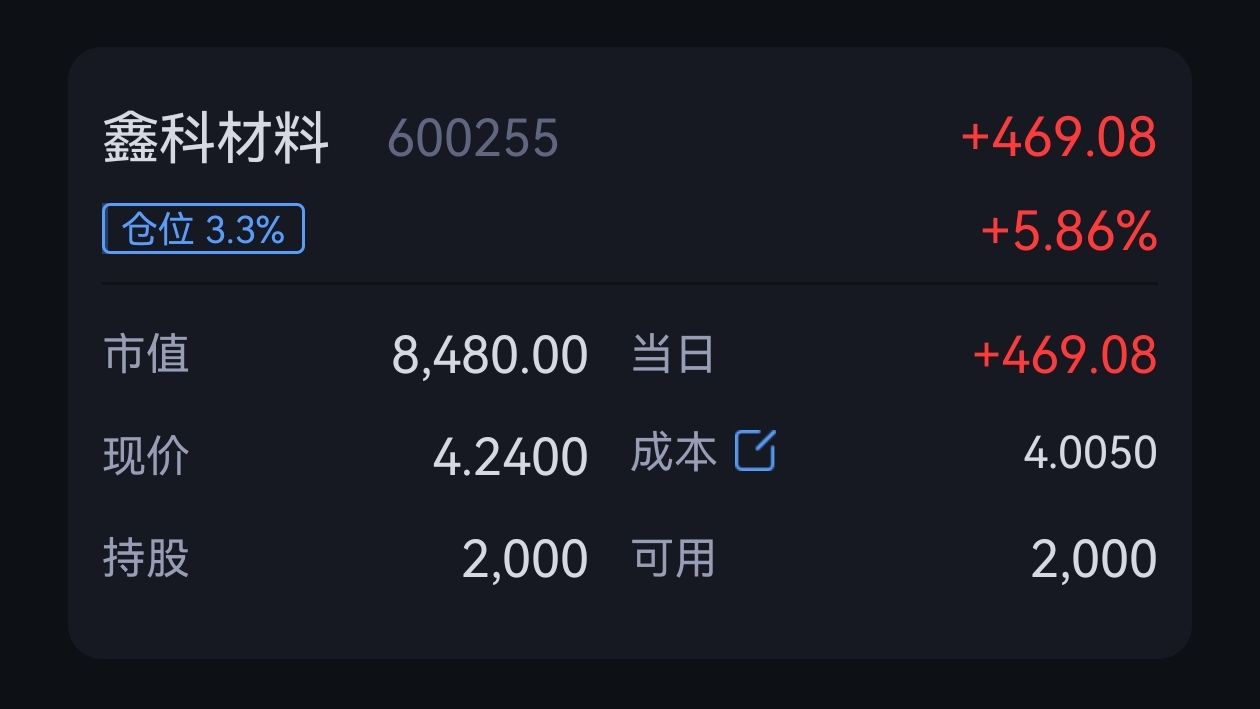 $鑫科材料(SH600255)$ 啊?传说中无心插柳柳成荫,就买了一点点,意外了