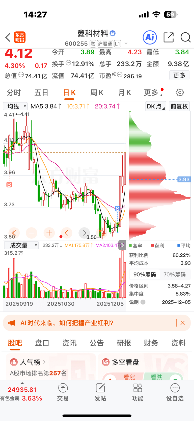 $鑫科材料(SH600255)$ 辛辛苦苦拿了3个月,终于埋在了最低点