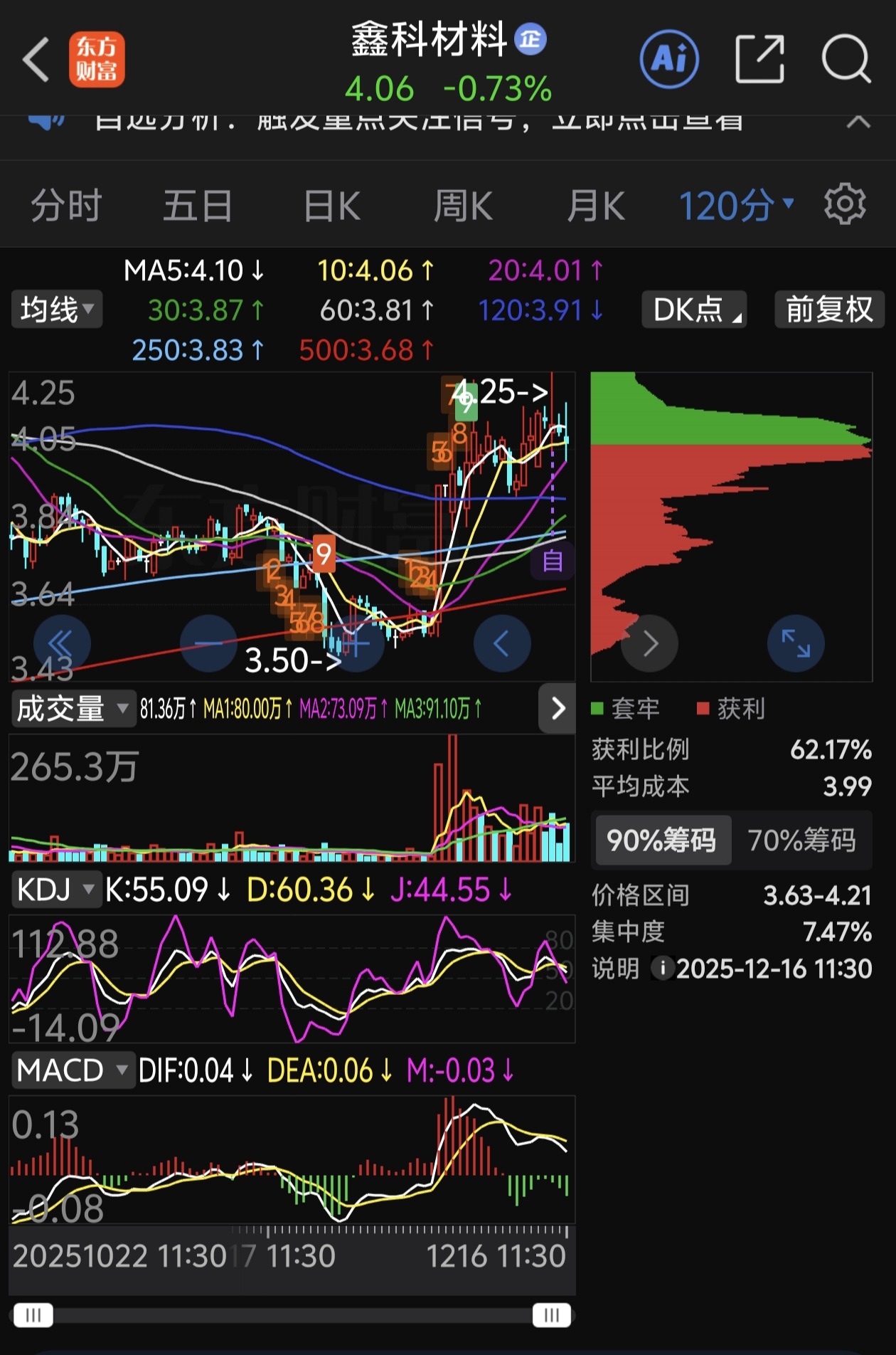 $鑫科材料(SH600255)$ 120分钟顶背离