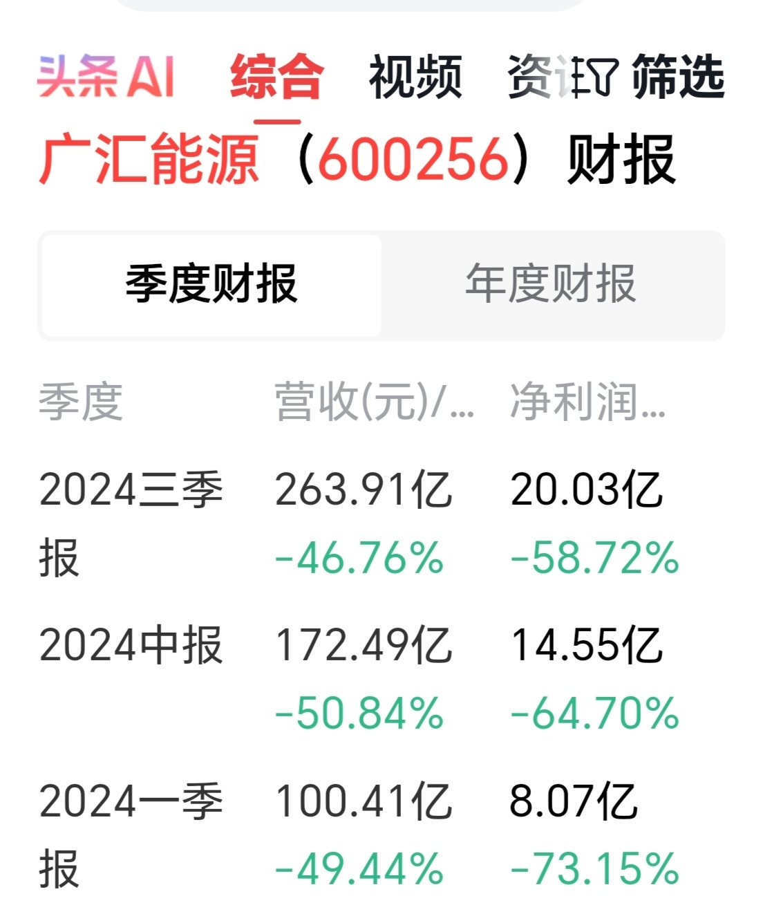 $广汇能源(SH600256)$ 广汇能源2024年业绩正在逐季回升,看季报。到目前为止一月底广汇能源没出24年年报预报,最起码可以看出广汇能源今年业续下降不会超过百分之50。业绩在回升,望25年一季度有更好的的回升。