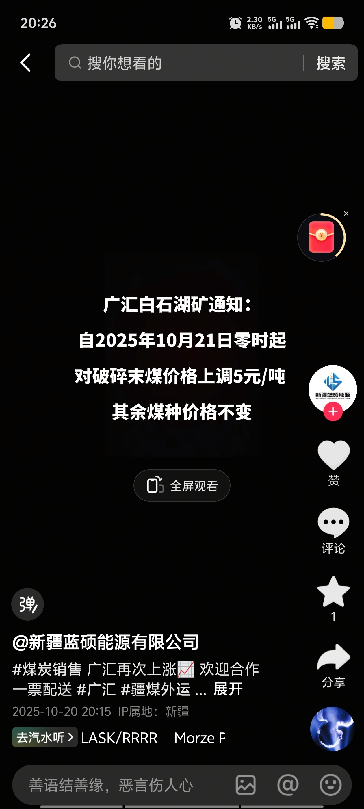 $广汇能源(SH600256)$ $广汇能源(SH600256)$ 根据公开信息整理:广汇马郎矿9月21日涨10元,10月15日涨5元,17日涨5元(碎块煤涨15元)。马郎截图如下。白石湖10月14日涨5元,21日涨5元。白石湖截图如下。截止10月12日的价格,沫煤已经由9月份的135涨到160。上半年吨煤利润还没有20元,四季度业绩会明显增加,开采成本不变的情况下,涨价基本都是利润。