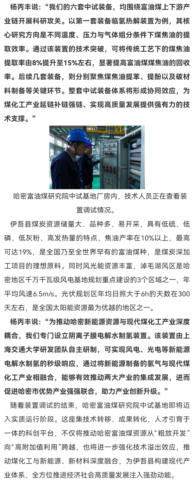 哈密富油煤研究院中试基地,基于富油的煤绿氢耦合煤化工装置调试结束,进入中试阶段。