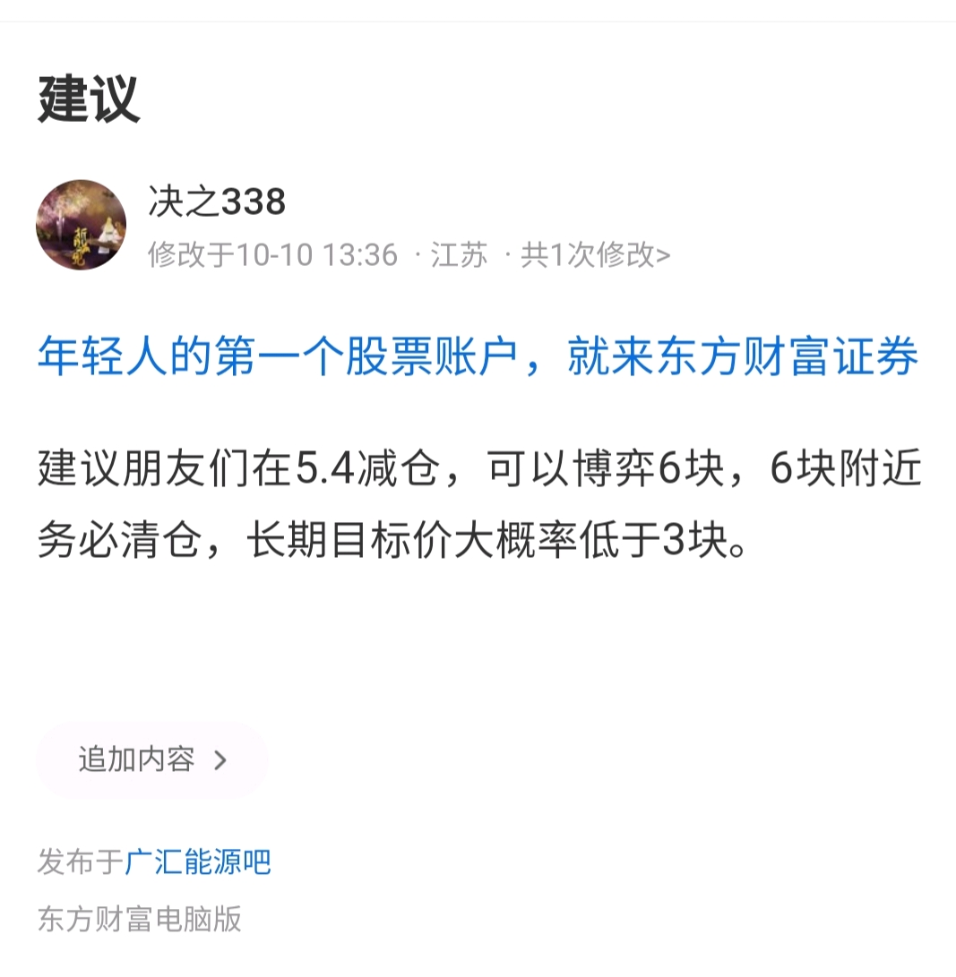 温馨提示: 1.根据《证券法》规定,禁止编造、传播虚假信息或者误导性信息,扰乱证券市场;2.用户在本社区发表的所有资料、言论等仅代表个人观点,与本网站立场无关,不对您构成任何投资建议。用户应基于自己的独立判断,自行决定证券投资并承担相应风险。《东方财富社区管理规定》