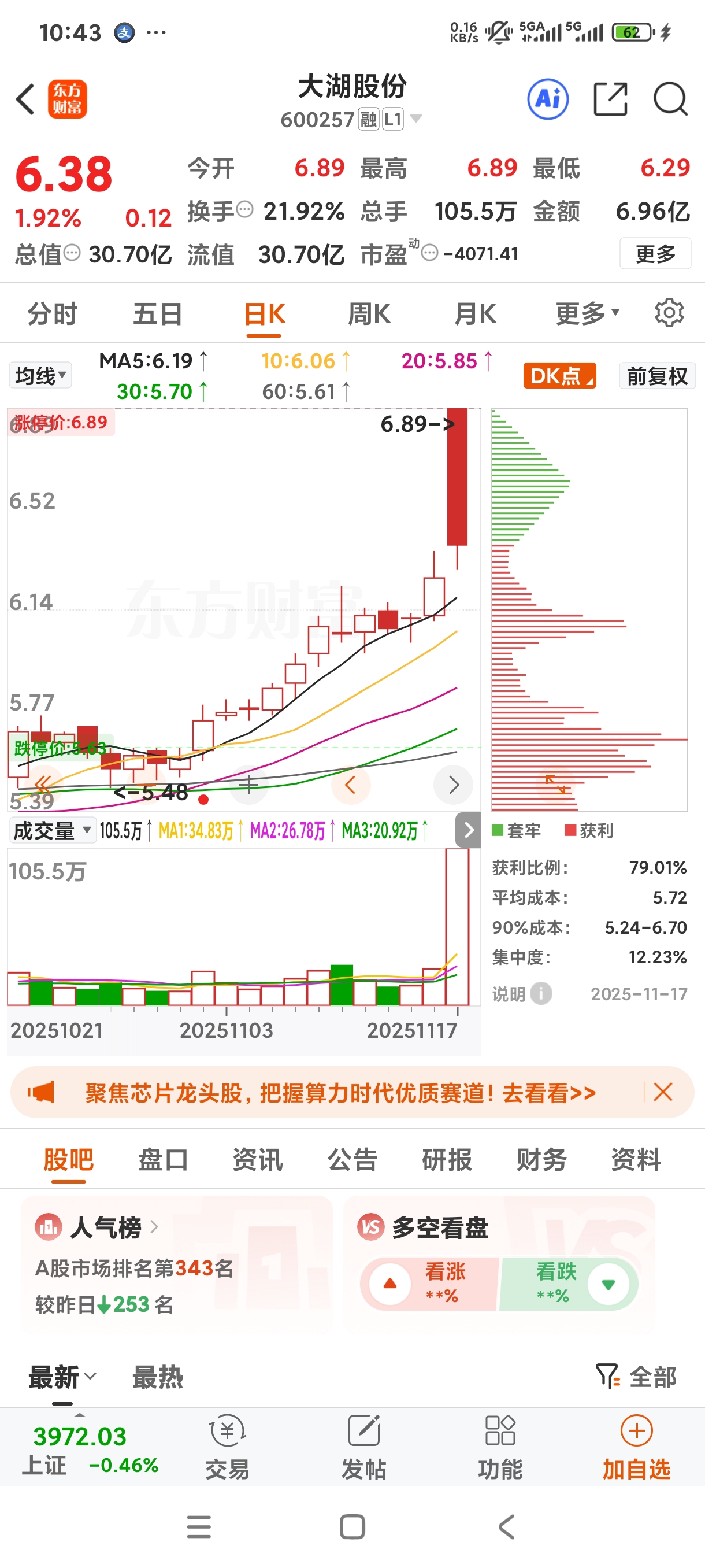 $大湖股份(SH600257)$ 有没有懂的大佬来说一下,这个放量是不是放的太大了,是在出货啊?有这根实体阳线,带下影线。明天会高开么,还是直接低开低走?