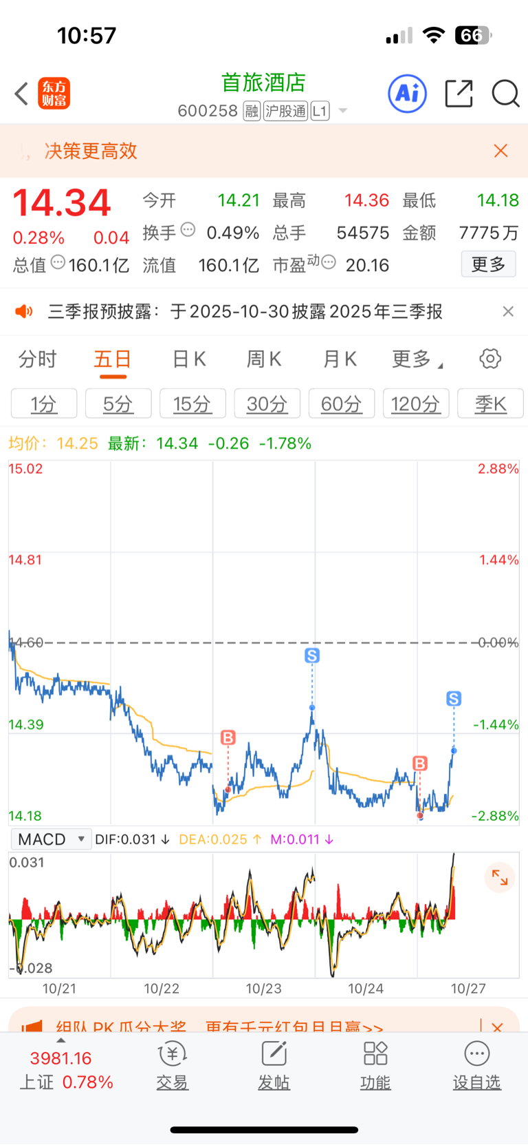 $首旅酒店(SH600258)$ 不涨真无聊,T吧