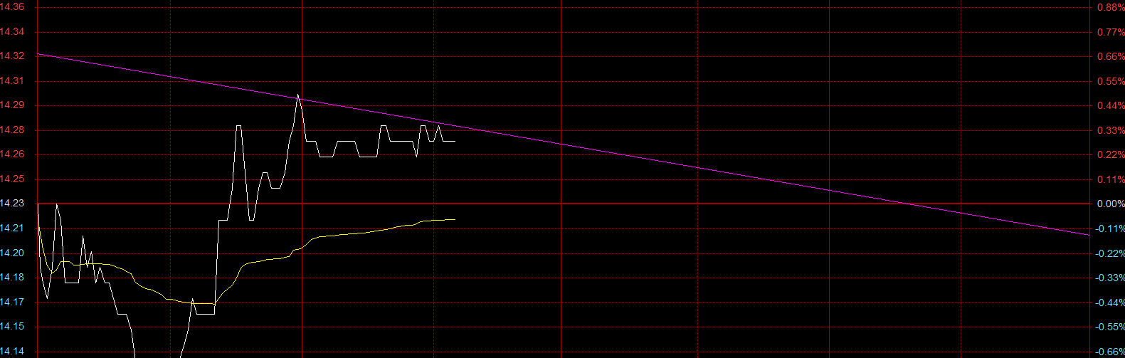 这根线是我昨天画的,没想到今天是真直接给它给出了最高点,也就是说下午收盘价不会高于14.21。但我希望我是错的,只有突破了这根压力分时线才会一飞冲天