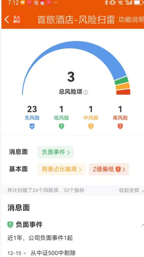 $首旅酒店(SH600258)$ 不看好,企业高管离职,股价下跌,有重大负面事件,口碑差,请谨慎购买,在这个股票下面有个股吧,股吧后面有个财务,下拉会看到风险扫描,看图,