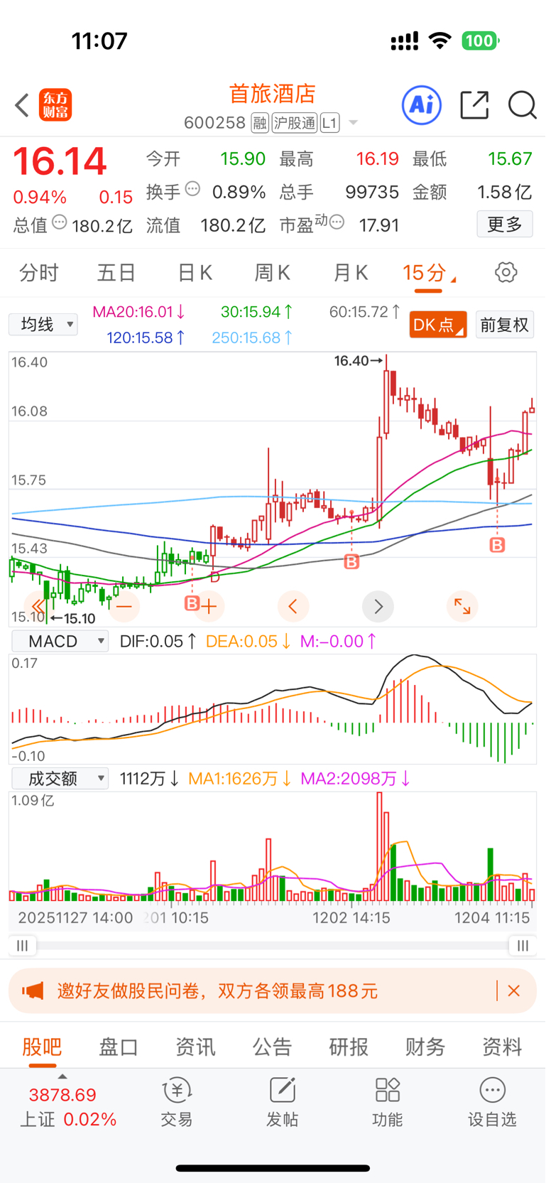 最近运气还行,把握低点我一直学不会,日线整体ok,15min蒙上几笔。目前仓位到