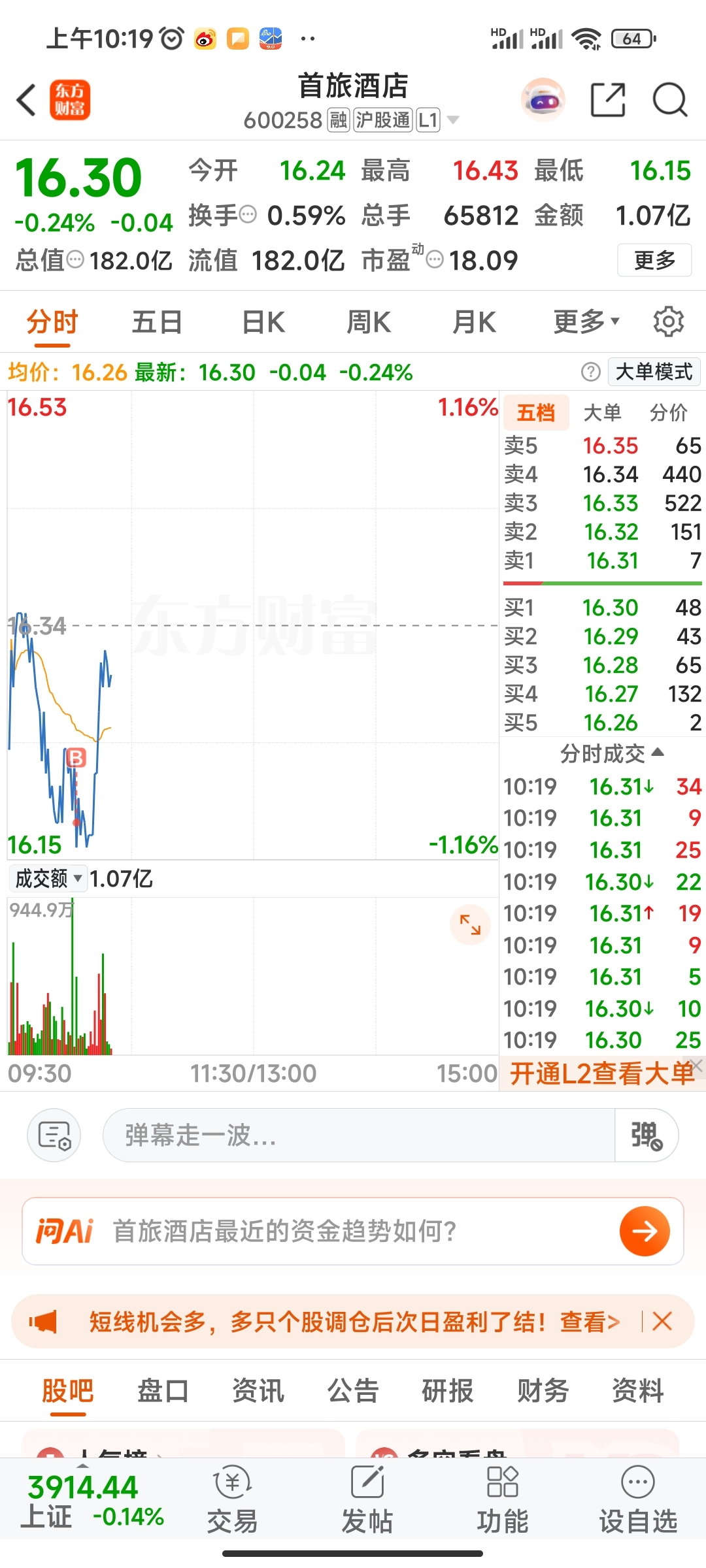 $首旅酒店(SH600258)$ 16.15是 回踩的的低点,