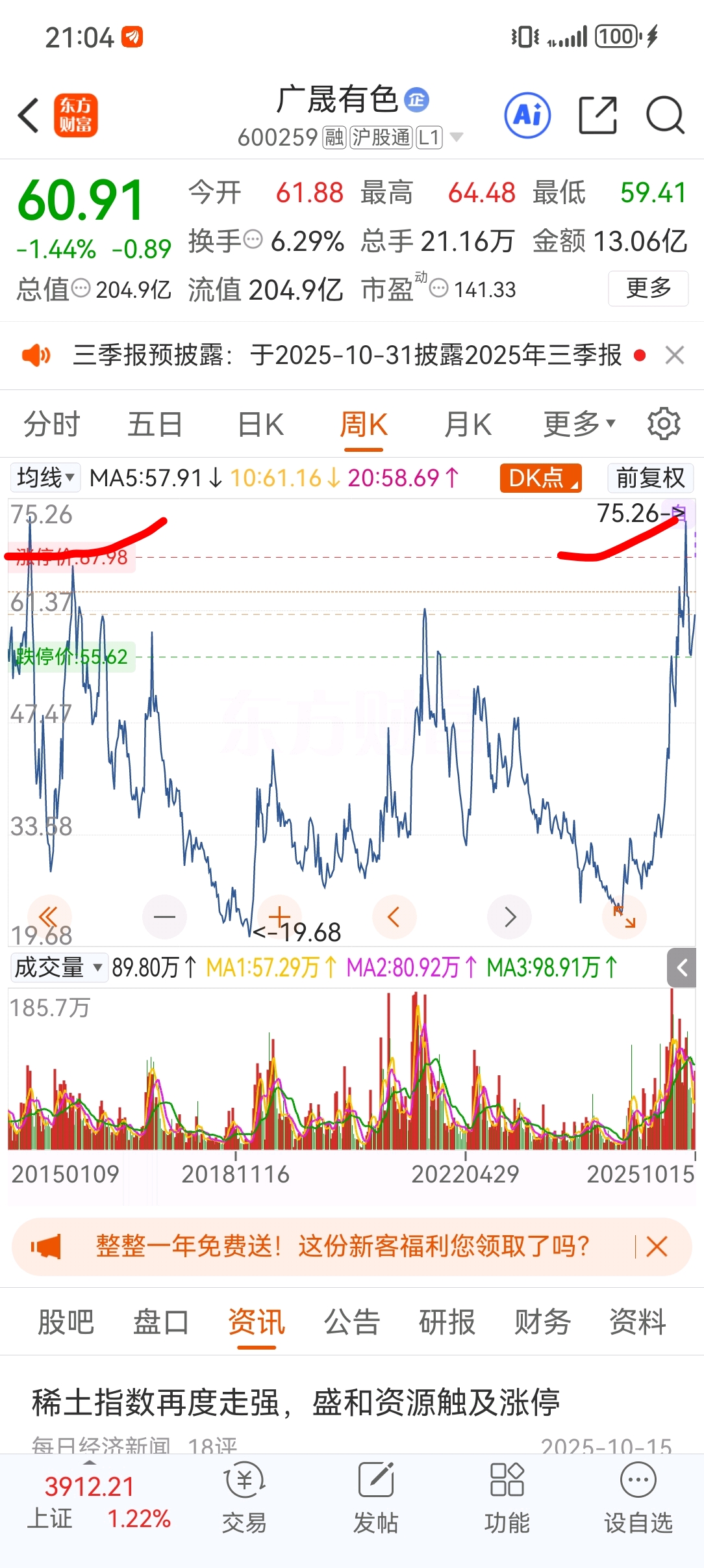 $广晟有色(SH600259)$ 为什么周k最高点头尾都是75.26元? 过不去了?大佬能解释一下什么意思吗