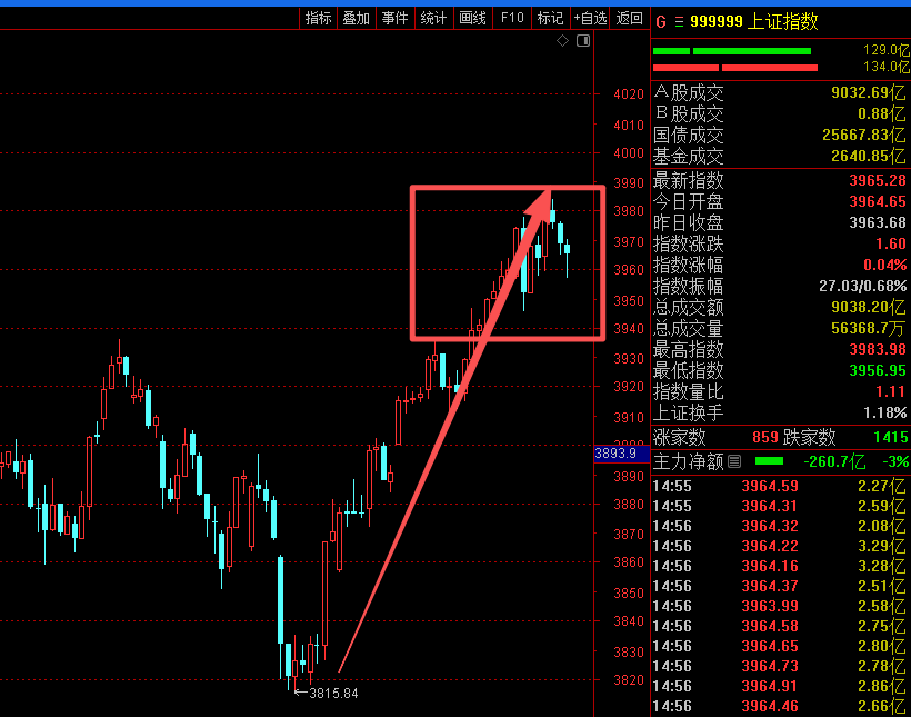 指数这笔六十分钟的向上的趋势,还没有像样的调整呢,日线指数已经是九连阳了,近期指数有调整的需求了,不过向下太的调整空间应该是看不到,指数近期在这个位置,六十分钟的走势构建中枢吧,接下来指数在3940到3980这个区间里震荡。