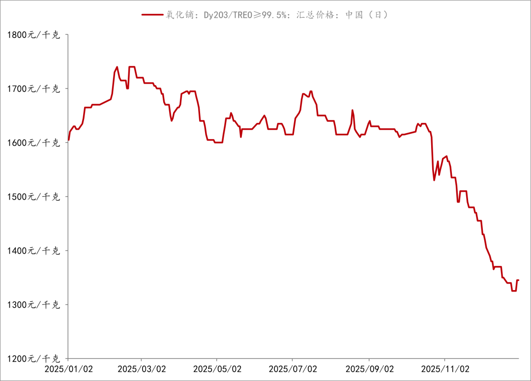 2025年,主要轻稀土产品价格有所上涨,但部分中重稀土产品价格仍呈下行态势。上海钢联数据显示,2025年12月31日国内氧化镨钕价格报60.75万元/吨,相较于2025年年初上涨52.45%。中重稀土方面,2025年下半年氧化镝价格降幅达16.7%,进入四季度后下跌速率加快。2025年氧化铽价格则呈现先上升后下降的走势,下半年价格降幅达15.8%。