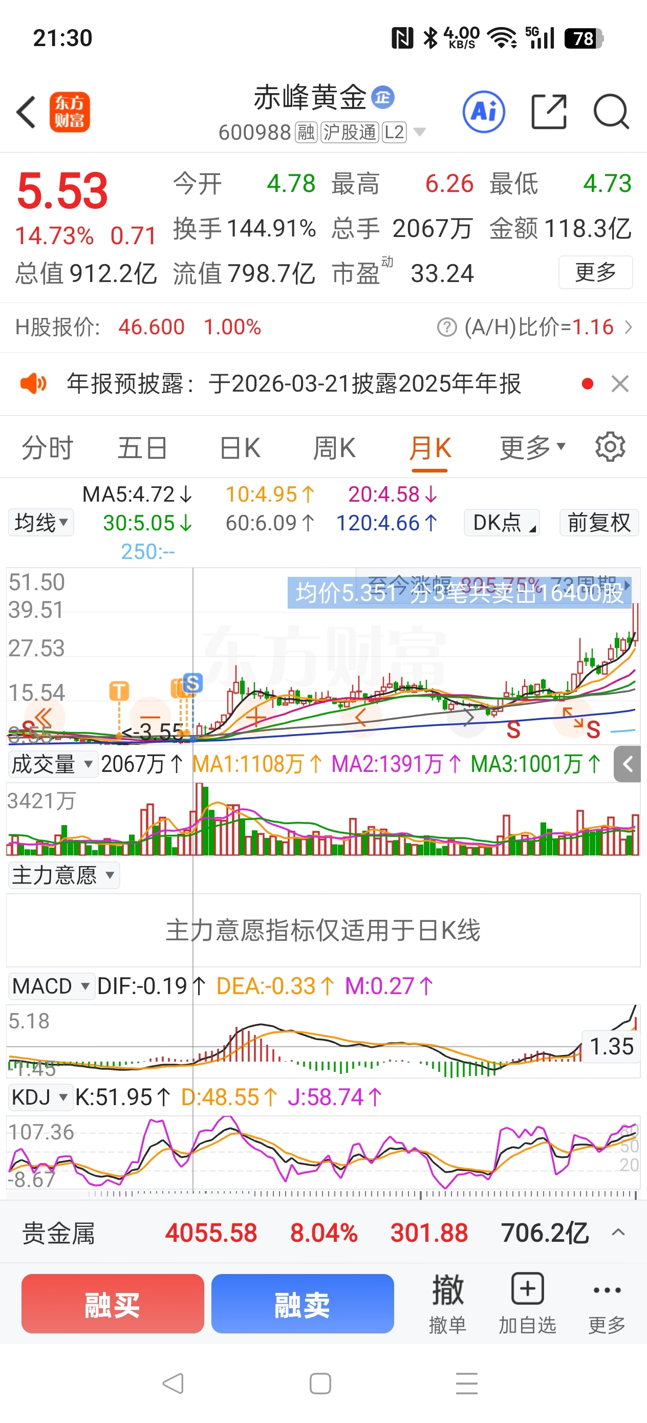 遥想2020年1月当天赤峰黄金大涨9点多,我6.7个点5块多就卖了,尾盘收盘就剩