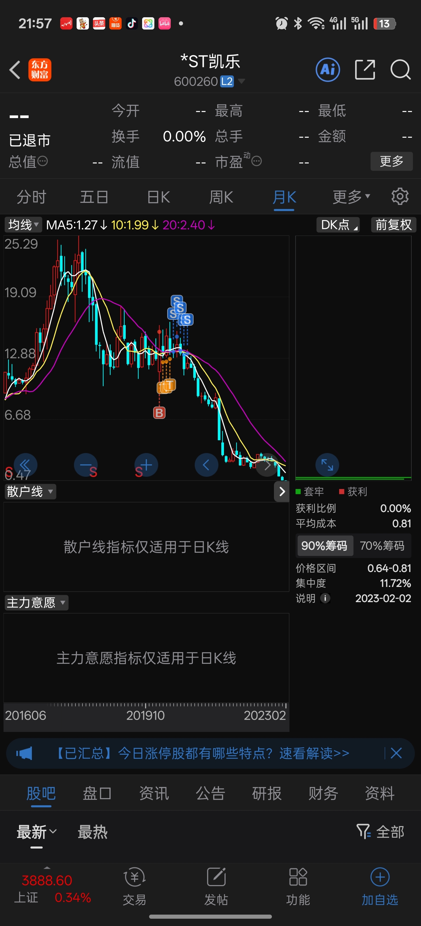 $*ST凯乐(SH600260)$ 运气好跑了 不然亏傻了