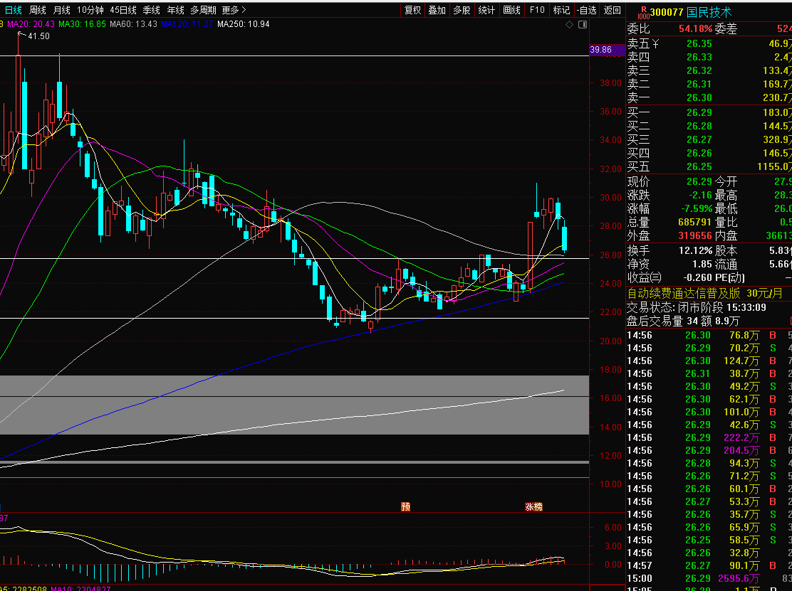 国民技术300077:国民今天早盘还好好的,但市场这么弱,想独善其身也有点难,不出意外国民也随市场回落了,不过好在下方26的年线支撑企稳了,没有跌破,被市场错杀,目前连续调整两天,又在支撑附近,市场在两会期间急跌以前也出现过,很快会补涨拉升回去,一旦下周补涨,那么国民有希望支持企稳反包,创业板涨起来也快,所以在等几天,看下周能否反包再说。而且支撑也不破拿拿先。