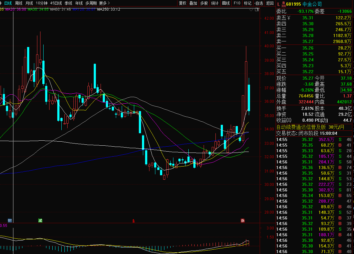 中金公司601995:中金今天低开低走,昨天拉升没封涨停,低开也在预期内,只是没想到市场环境这么差大盘跳个水,跳的有点深,不过全球的大跌,我们也只能认,所以赶紧找原因,没有明显的利空,就老美威胁了下说曾税,这个不都习惯了吗,证券异动两天我觉得不太可能就熄火了,总不能和我们闹着玩吧,而且这种急跌后后面短时间很快就会补涨上去,所以下周如果真的走反弹补涨,证券估计也要继续出力,所以今天没有跑,先继续拿拿,下方34附近筑底区域也不远,跌不到哪去。