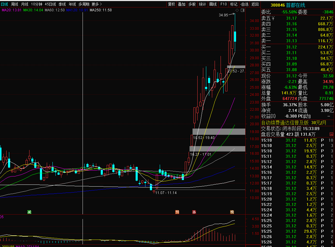首都在线300846:首都是已经走出柱升浪在高位的,今天早盘低开高走,而且创出新高了,但市场太弱,还是被拖累跟风跳水回调了,跌了6%左右,不过下方30的支撑没有跌破,均线也依然向上运行,下周如果真的补涨,有可能有反包可能,注意下周市场情绪变化,一旦回暖,该股支撑也稳住,在看抓不抓。