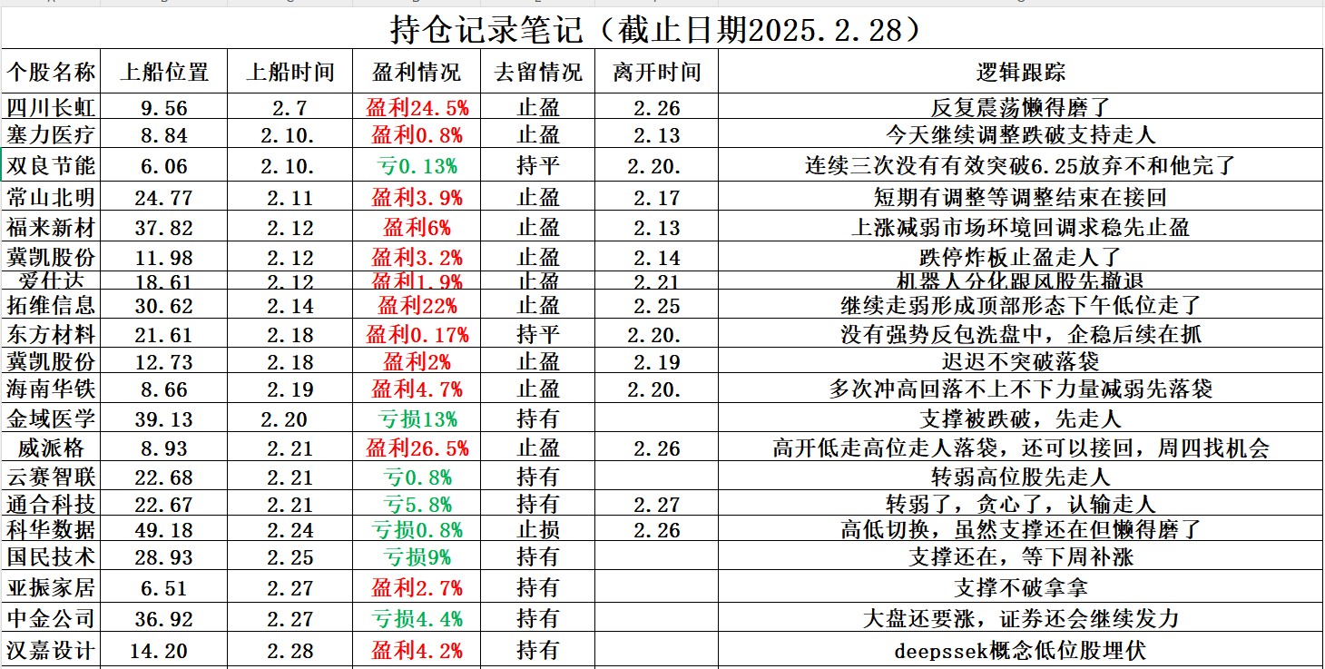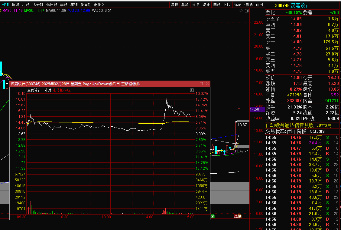 汉嘉设计300746:汉嘉是deepseek概念,这个股他符合当前的高低切换,属于低位板块张飞天了,但该股泻涨没什么跟风拉升,另外板块调整了不少时间一些强势的开始逐步穿越出来,有企稳重新爆发趋势,甚至今天早盘这个板块一些标的有所表现了,比如威派格和我们的汉嘉,但市场太弱,一些人又恐慌,每次接近两会都会这么来一下,只能说A股还是以前的A股,汉嘉高开5个点左右,因为市场弱,所以和大家说开盘后回踩在考虑入场,尾盘14点左右,开始直线拉升,最高冲到17个多点,收盘回撤了点,不过也还有8个点左右,在4个点附近抓的吃了4个点的逆势肉。看下周能否随市场补涨加速拉升了。