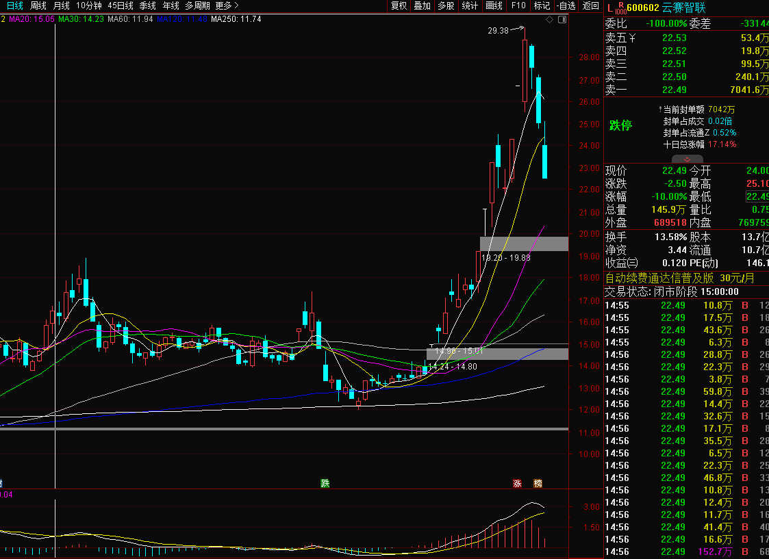 云赛智联600602:今天市场这么弱,云赛开盘虽然低开高走拉升了一段,但很快随着市场跳水的严重,也开始震荡回落,我在早盘9点40左右就说了撤退了,该股又是高位股,连续调整后,估计下周下跌力量就会减弱了,不过应该还会惯性低开适当下空方的力量,等下跌企稳走阳线了,板块调整到位重新拉升了在想办法把场子找回来。