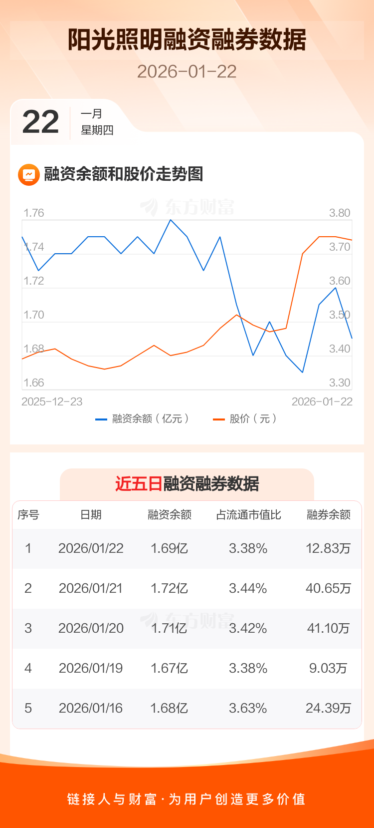 交易所最新数据显示,阳光照明于2026年1月22日获融资买入661.90万元,融资偿还1035.68万元,当日融资净偿还373.78万元。目前,该股融资余额1.69亿,占流通市值比例为3.38%。