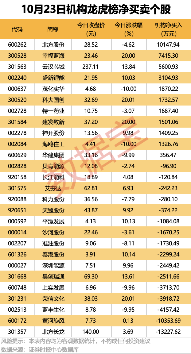 今日龙虎榜中,净买入个股有11只,净卖出的个股为16只。10股净买入金额均超千万元,北方股份获机构净买入1.01亿元,居首;其次是幸福蓝海、云汉芯城、盛新锂能,均获净买入超3100万元。