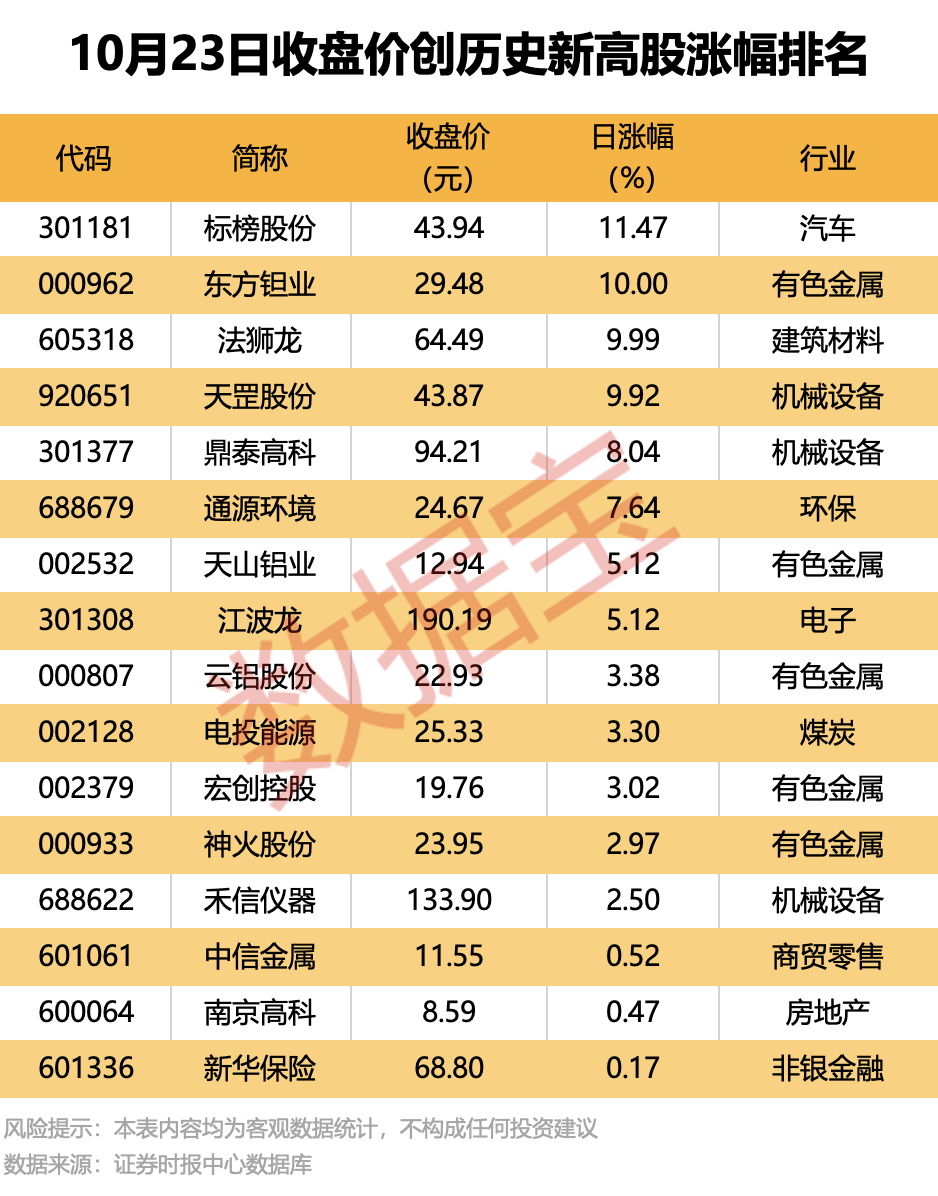 据证券时报·数据宝统计,不含近一年上市的次新股,今日共有16股收盘价创历史新高。从行业属性来看,有色金属、机械设备行业创新高的个股较为集中,分别有5股、3股出现在名单中。