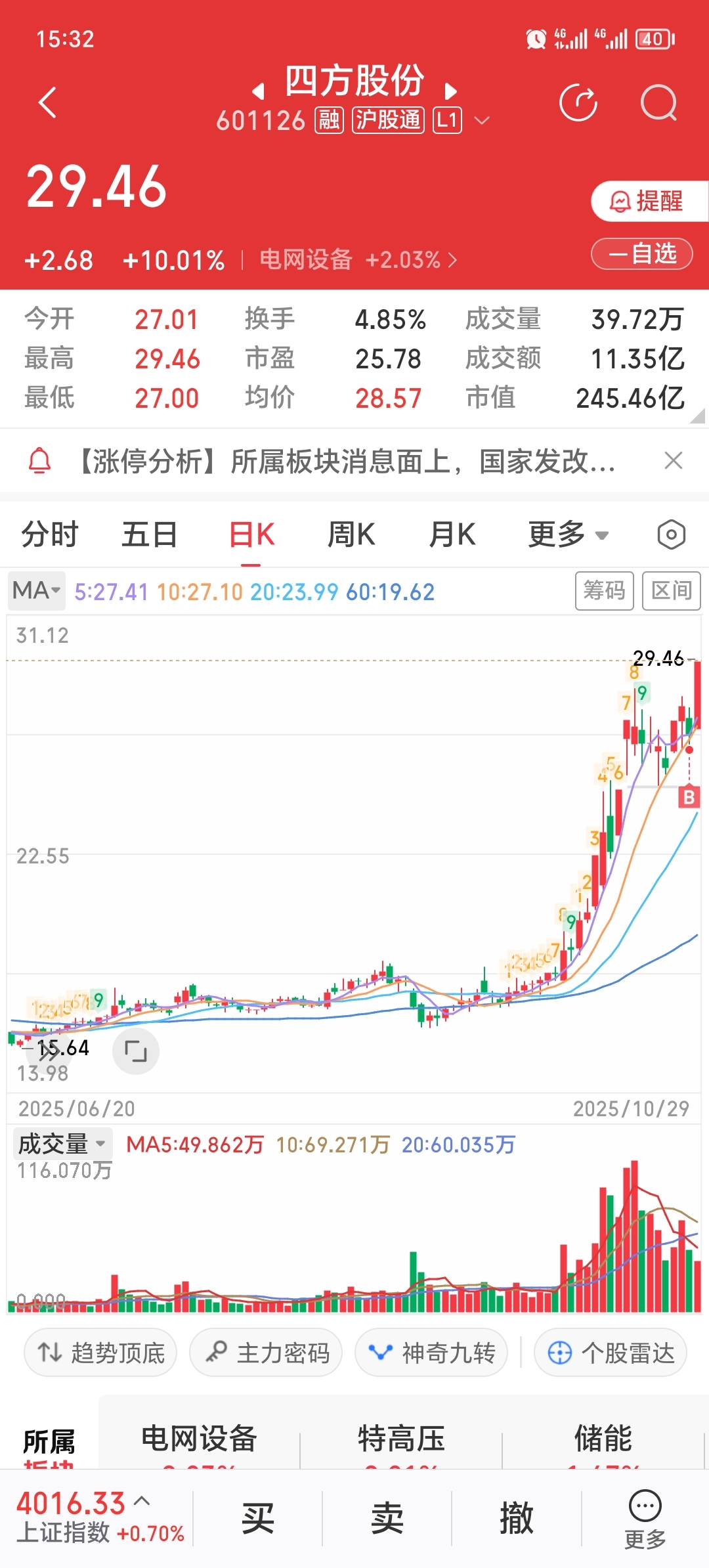 缩量洗盘结束,明天反转开始,参考昨日我买的四方股份。