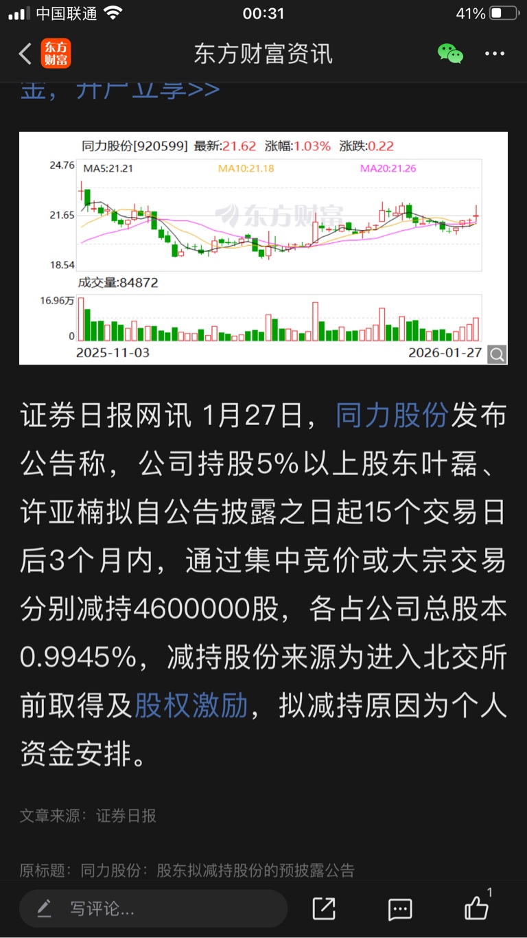 大家一起加油//@CoffeeDRIVER : 眼见目前樊斌和叶三石系持股数旗鼓相当,这则蹦出来的减持公告颇为蹊跷。叶磊和许亚楠的减持股数完全一致,刚好都不到1%,一点都不带装的,目的大概率是日后大宗交易给某两人,以谋的两个董事席位,壮大队伍。新增的董事席位虽好,但是最终投票还得拼持股数量,预料同力股份的二级市场少不了两方的抢筹了。